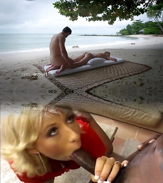Nude blond woman, Ariel is getting a delicate rubdown on the beach, from a splendid stranger
